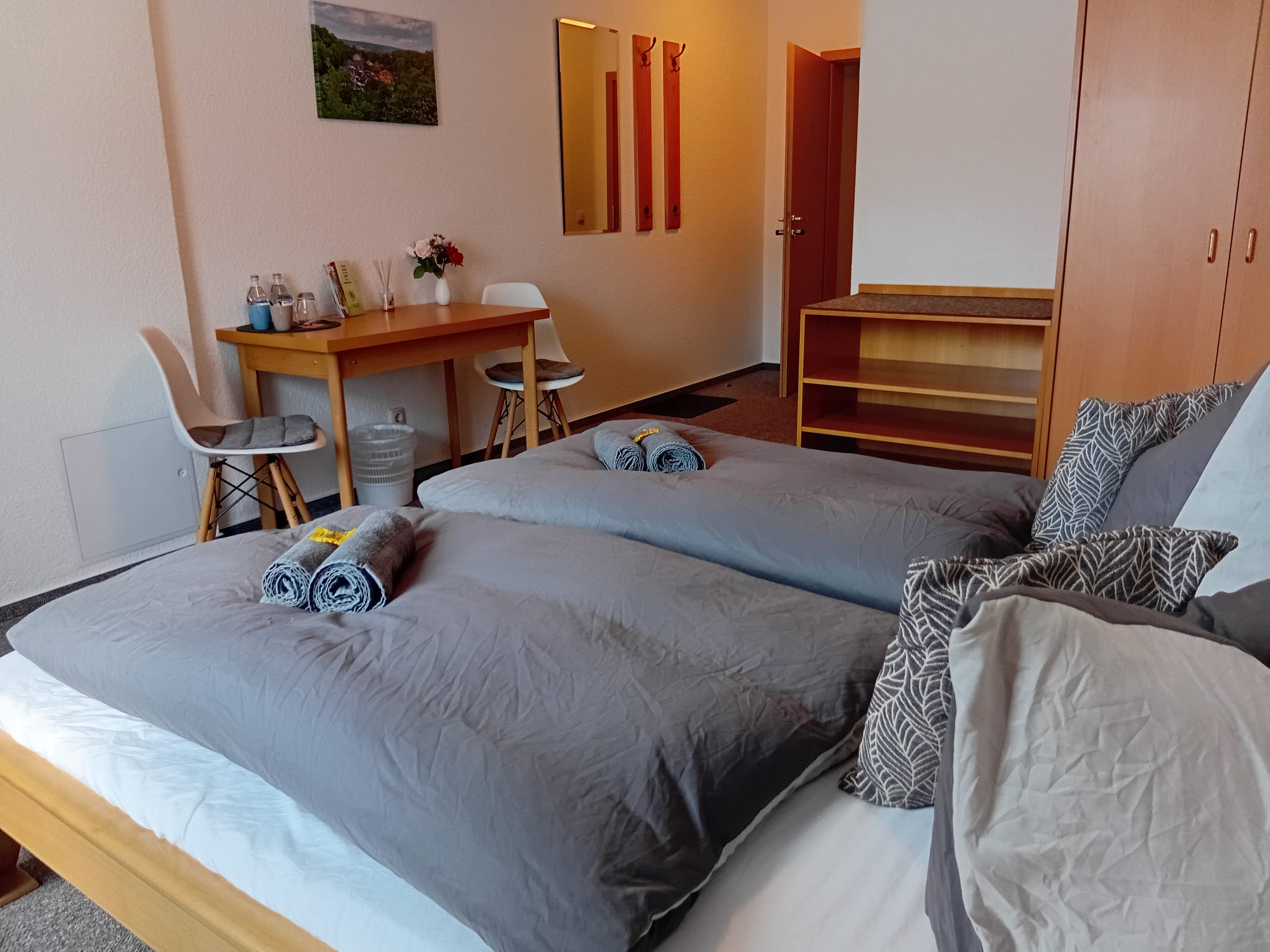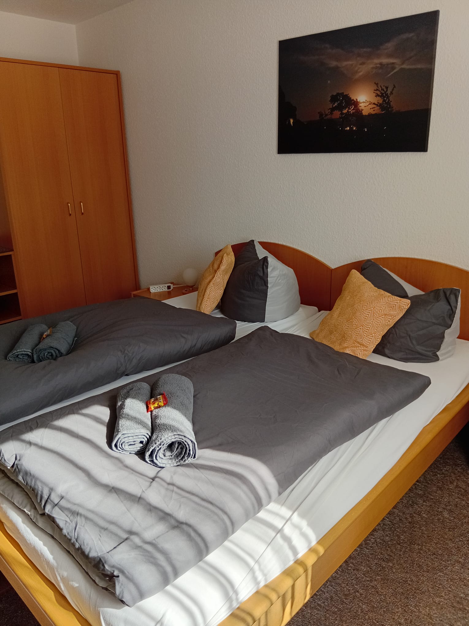 Unsere drei hellen und geschmackvoll eingerichteten Doppelzimmer in Helmsdorf, einem kleinen Ortsteil von Dingelstädt im Eichsfeld, bieten Platz für 1–2 Personen. Sie sind ideal für Paare, Alleinreisende oder Radurlauber, die Ruhe und Natur genießen möchten.